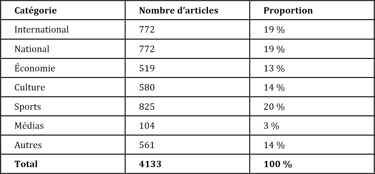 Concrètement, nous avons utilisé une base de données d’un peu plus de 4 000 articles issus du journal Le Soir, quotidien de référence en Belgique francophone. Chaque article de cette base de données inclut un titre, le corps de l’article, et une catégorie attribuée par la rédaction du Soir, parmi les sept possibilités suivantes : International, National, Économie, Culture, Sports, Médias, Autre. Ces catégories sont mutuellement exclusives (un article appartient à une et une seule catégorie). Les articles ont été collectés sur une période de six mois, entre août 2018 et janvier 2019, au moyen d’un script d’indexation (web crawling) développé spécifiquement pour les besoins du projet. Comme indiqué dans la Table 1 ci-dessous, le nombre d’articles par catégorie varie entre 500 et 800 (excepté pour la catégorie Médias qui ne contient que 104 articles).