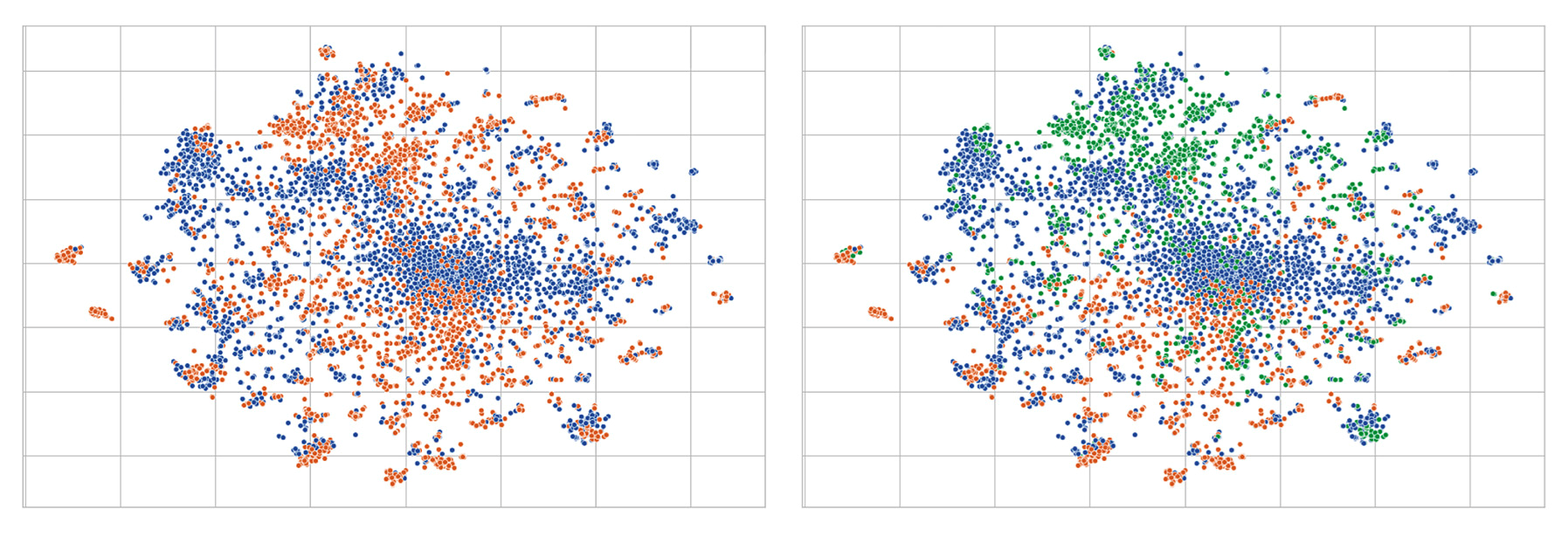 Figure 1. Visualisation des sujets traités au sein du corpus d’articles fiables et non fiables au moyen de l’outil t-SNE. Gauche : articles non fiables (points bleus) et fiables (points orangés). Droite : articles non fiables (points bleus), fiables « international » (points orangés) et fiables « États-Unis » (points verts)