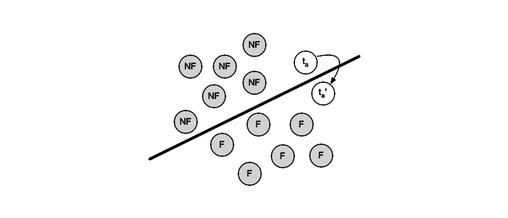 La figure 2 représente un classifieur élaboré à partir d’un apprentissage supervisé basé sur 12 articles d’entraînement : six articles considérés comme fiables (F) et six considérés comme non fiables (NF). Le classifieur qui en résulte est symbolisé par la ligne noire qui distingue correctement les données d’entraînement. Il y a également un article-test ta, inconnu du classifieur, qui est initialement (et correctement) classé comme non fiable. L’objectif poursuivi par un adversaire sera de modifier ta de manière minimale en un article similaire ta’ de telle sorte que ta’ soit classé incorrectement comme fiable.