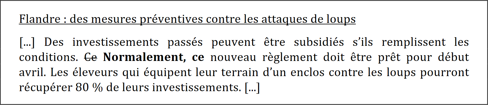 À partir des listes de mots discriminants, nous avons été en mesure de fabriquer manuellement des exemples adversariaux. Ainsi, la modification suivante a permis de faire passer la probabilité de non fiabilité obtenue par le RNN de 65 % à 45 %, faisant ainsi basculer l’article du côté fiable.