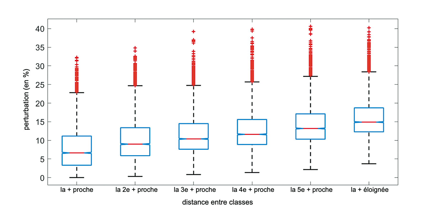 L’observation principale que nous pouvons faire est que la médiane de chaque boîte à moustache se situe entre 6 % (pour la classe la plus proche) et 15 % (pour la classe la plus éloignée). Cela signifie donc qu’une perturbation minimale d’environ 6 % pour la classe la plus proche et jusqu’à 15 % pour la classe la plus éloignée est nécessaire pour classer erronément 50 % des articles. Nous observons également que pour certains articles, des perturbations beaucoup plus faibles sont suffisantes : inférieure à 1 % pour la classe la plus proche, et 3 % pour la classe la plus éloignée.