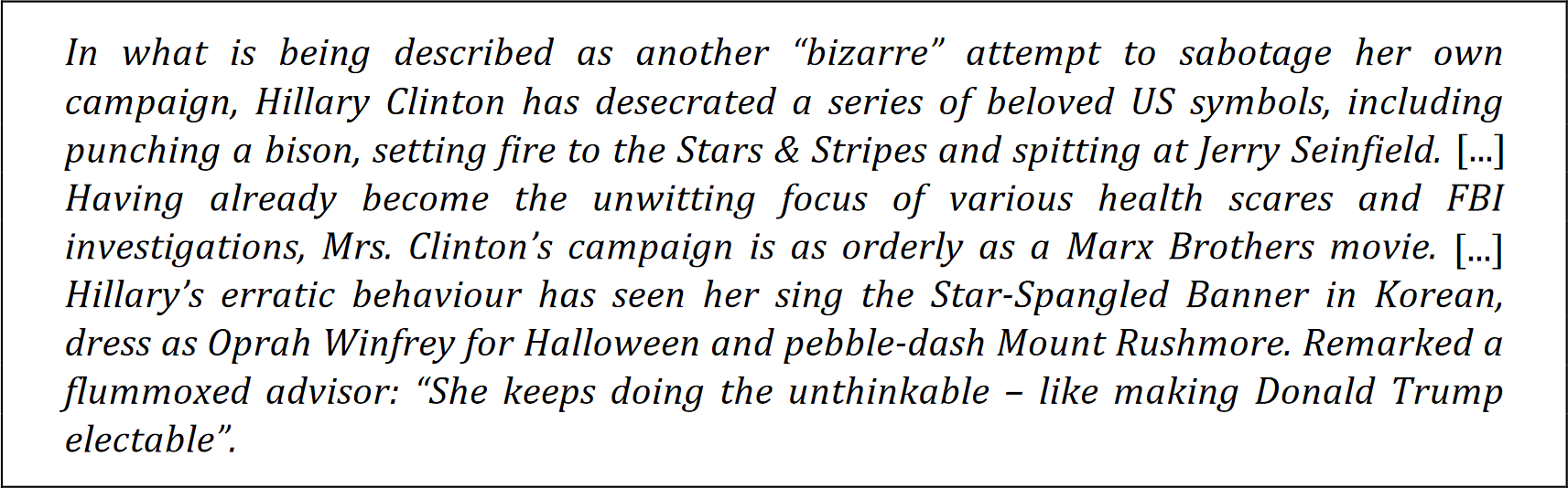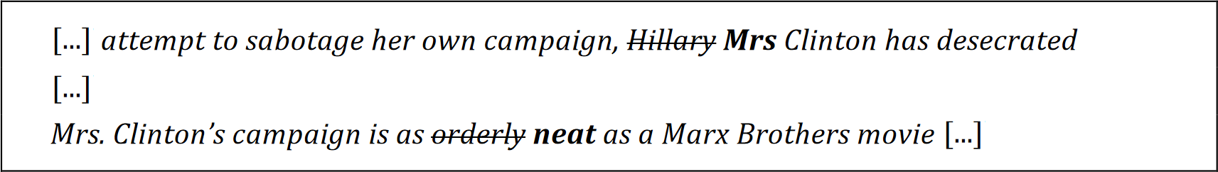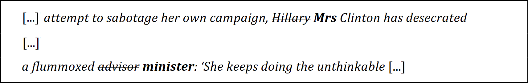 En comparaison à notre première étude de cas où les modifications adversariales devaient se focaliser principalement sur des mots sémantiquement neutres afin de minimiser la probabilité d’une perception humaine, nous observons que dans le cas de la détection de la désinformation, les modifications peuvent s’opérer sur des mots davantage marqués sémantiquement (en remplaçant « Hillary » par « Mrs. » par exemple), ce qui facilite potentiellement la tâche d’un adversaire. Cela peut s’expliquer par le fait que la nature fiable ou non fiable d’un article est plus difficile à caractériser que les catégories identifiées dans notre système de recommandation d’articles.