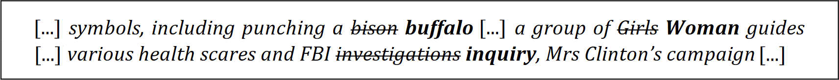 Une fois ce score calculé pour chaque mot, il reste à décider quels mots retirer ou ajouter afin de faire basculer la classification vers la classe cible. Le choix des mots à modifier dépendra bien évidemment à la fois de la manière dont ils influencent la classification, mais également de leur poids sémantique dans le contenu de l’article : seront ainsi privilégiés les mots qui n’altèrent pas ou peu le contenu sémantique de l’article. Si une fabrication manuelle de ces exemples adversariaux paraît la méthode la plus immédiatement accessible (voir exemples dans les sous-sections suivantes), il existe également des perspectives d’automatisation qui seront brièvement explorées en fin de section.